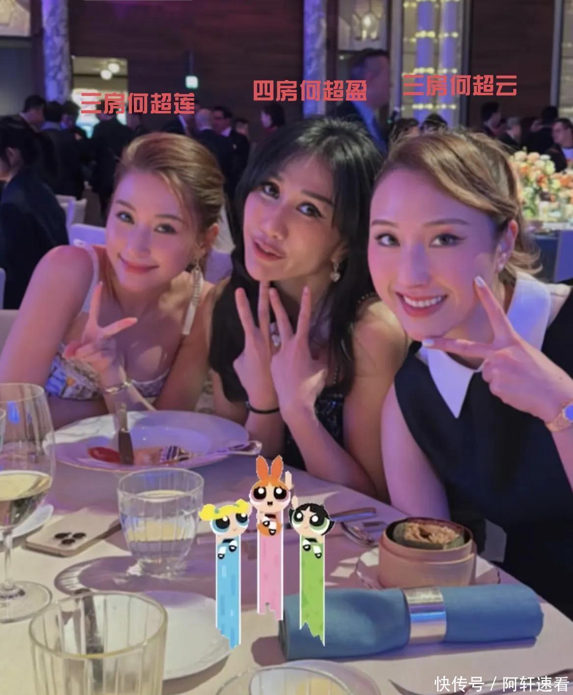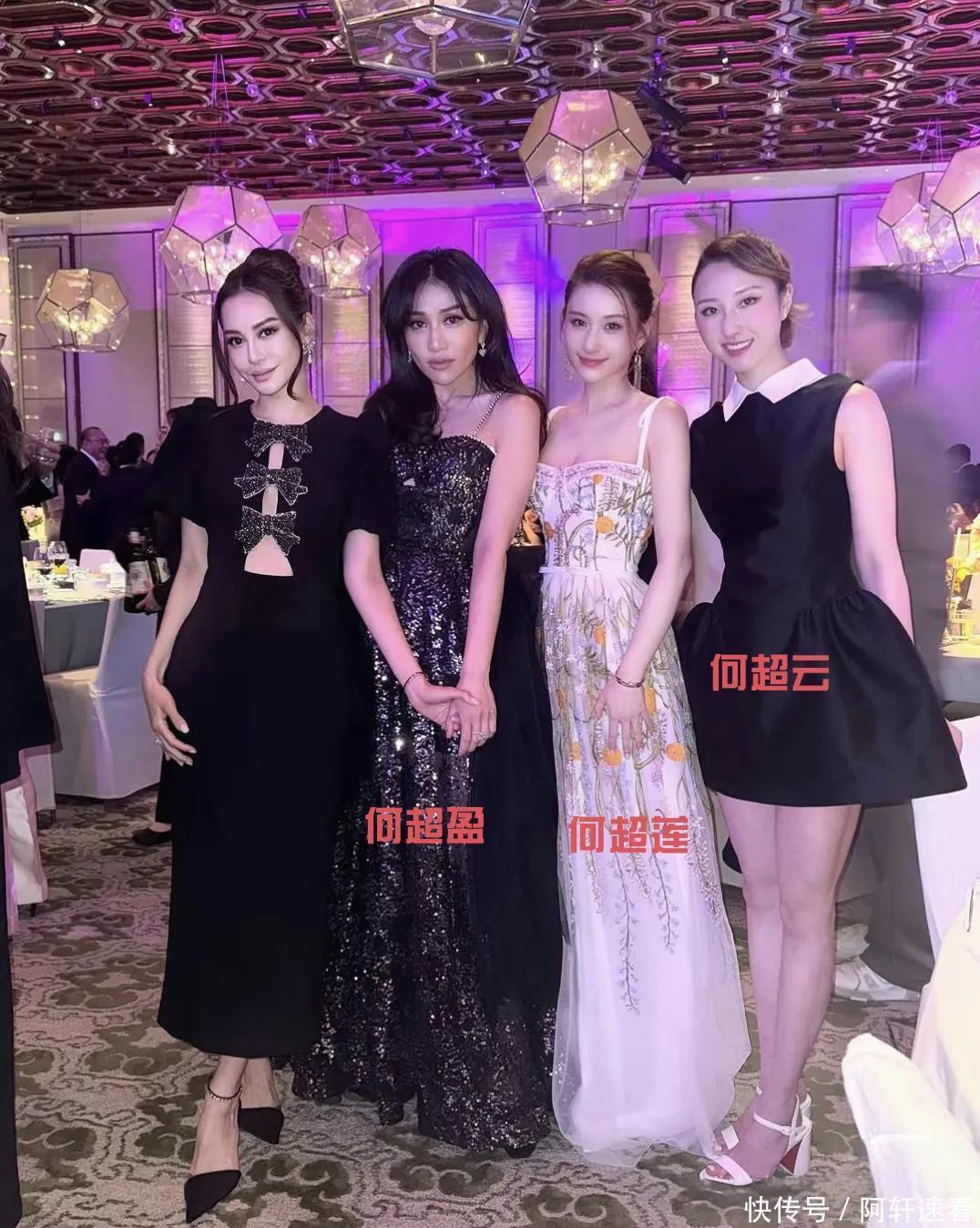 4月1日,二房女儿何超琼、三房女儿何超云和何超莲、四房女儿何超盈,这几个姐妹花出席同一场晚宴,在现场亲密互动。